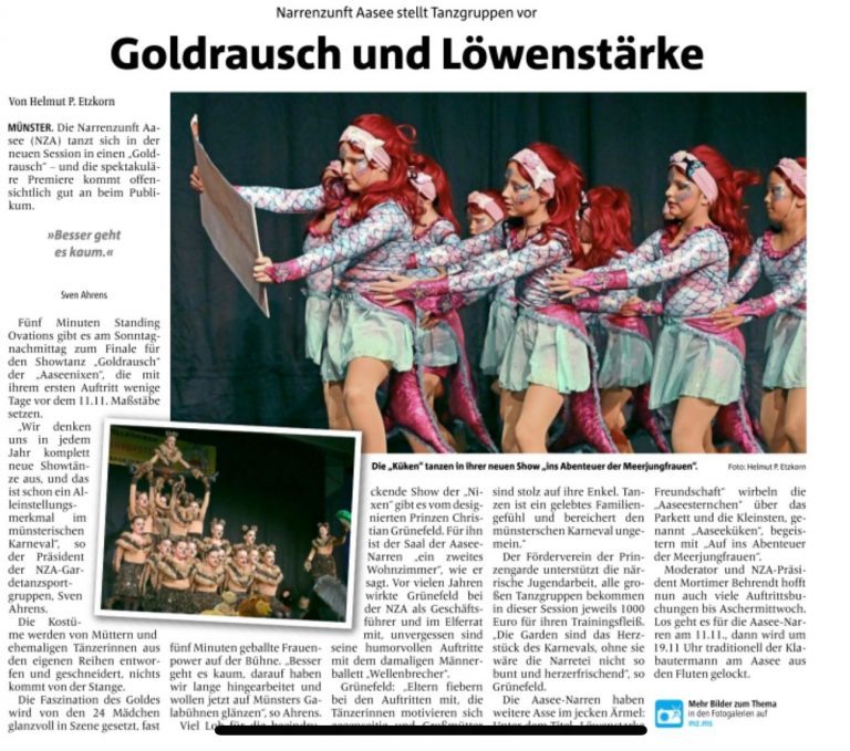 Zu Beginn der Galasitzung bei den Aasee-Narren am Freitagabend kommt gleich das Flaggschiff mit dem Schautanz auf die Bühne im Atlantic-Hotel: Mit „Verhext nochmal – was ist hier denn los?“ erobern sich die Aaseenixen in dieser Session die Herzen der Jecken. Nach dem glanzvollen Auftritt in der Fernsehgala „Westfalen haut auf die Pauke“ präsentieren sich die Mädchen auch beim Heimatgastspiel in Top-Form, ein großer Dank geht an die Betreuerinnen Sabrina Plümpe, Katharina Uka Wolff und Sabrina Weduwen.