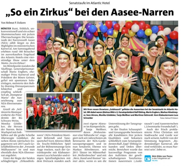 Auf der Galasitzung der Narrenzunft Aasee haben die Aaseenixen am Freitag im Atlantic-Hotel einen beeindruckenden Schautanz präsentiert. Einer seit mehr als 50 Jahren aktiven „Narrenikone“ wurde eine besondere Ehrung zuteil.